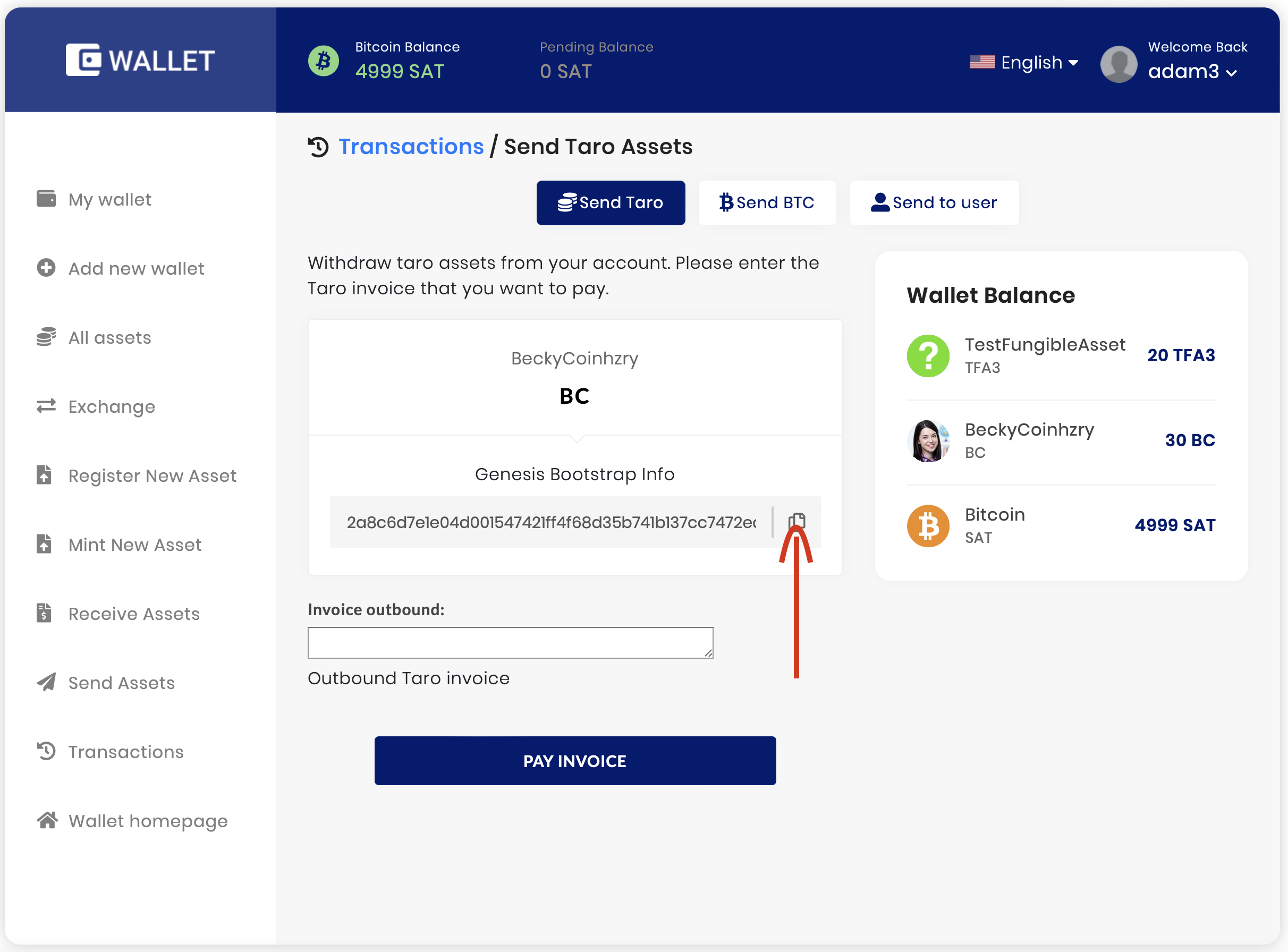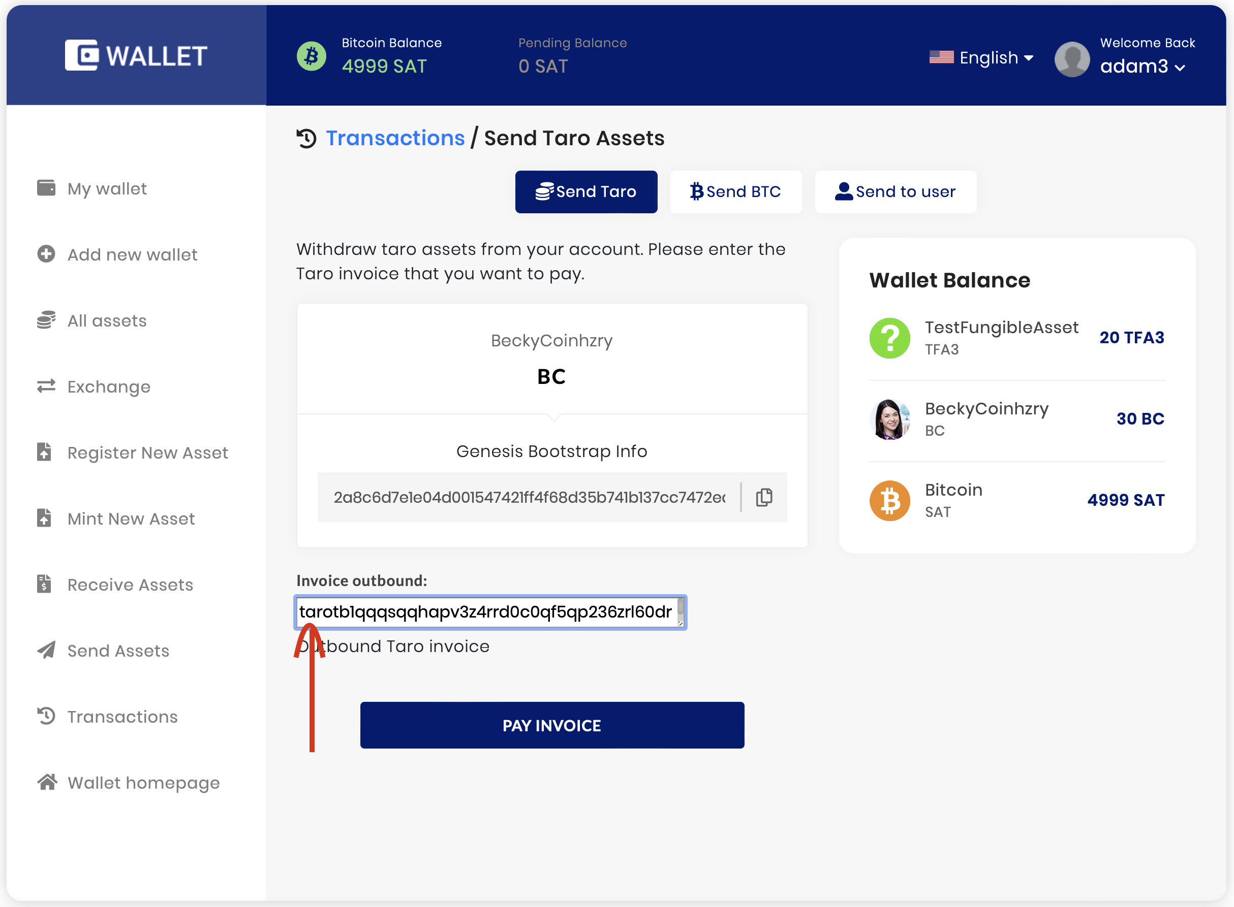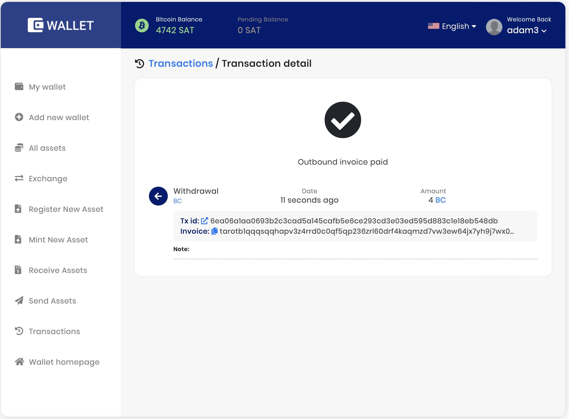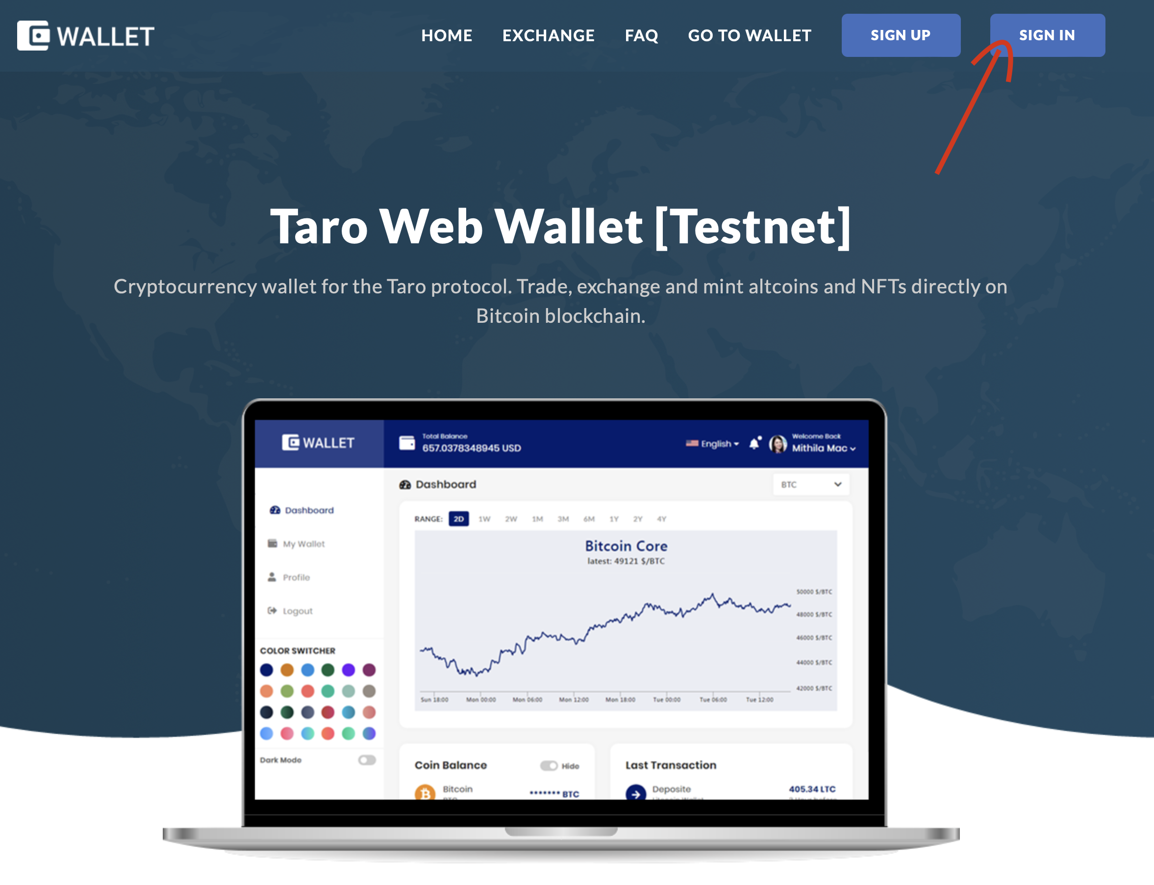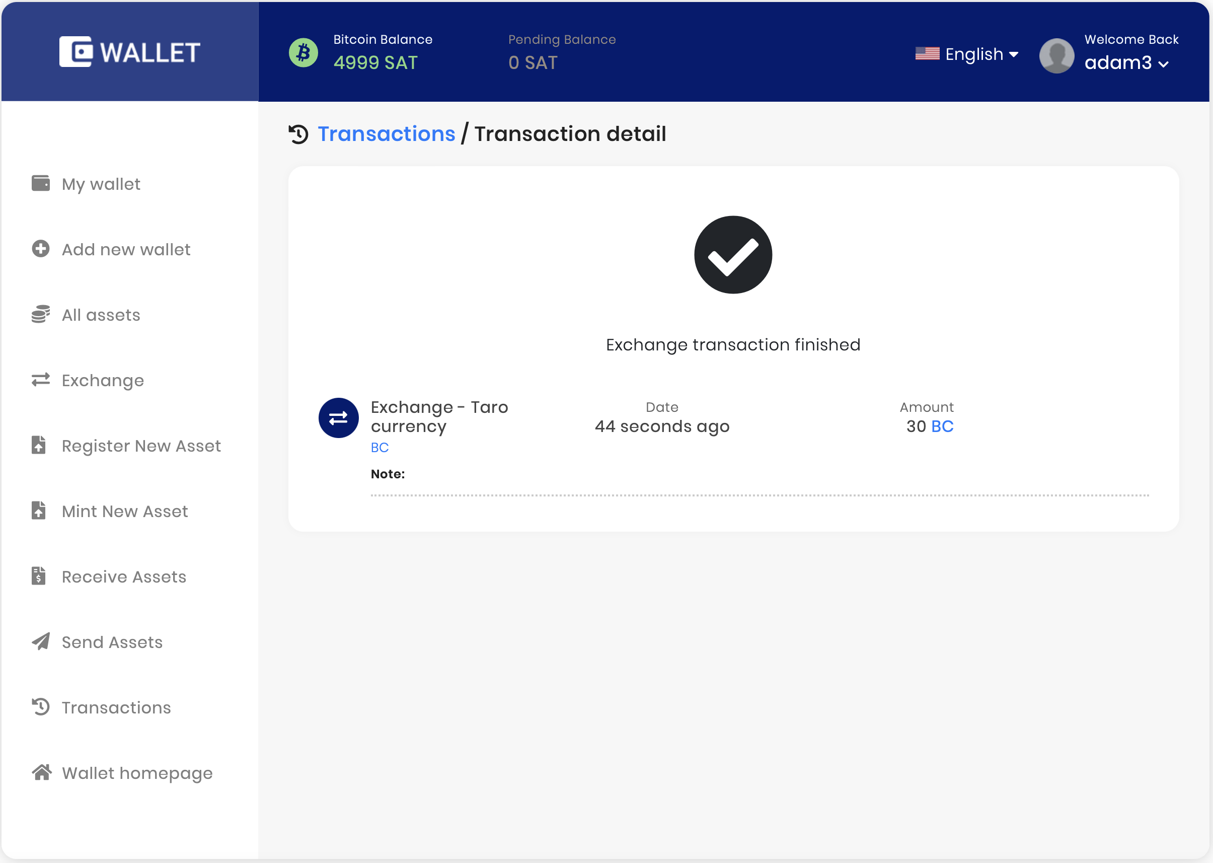 Clicking on [My Wallet](https://testnet.tarowallet.net/walletapp/balances) in the left menu will show you that you now have the amount of currency that you decided to exchange and that an amount of your testnet BItcoin was deducted.