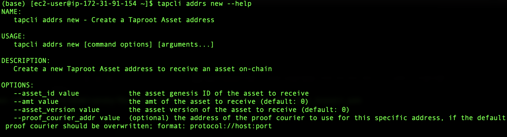 <figure><img src="https://2030877470-files.gitbook.io/~/files/v0/b/gitbook-x-prod.appspot.com/o/spaces%2FYPCqjMJwBzaMKLGWDjCH%2Fuploads%2F4qRVSvMFzlOl9CdamaYl%2Fimage.png?alt=media&#x26;token=b5edba87-3e68-4ea6-bb00-a192dc03627e" alt=""><figcaption><p>Generating a taproot assets address</p></figcaption></figure>