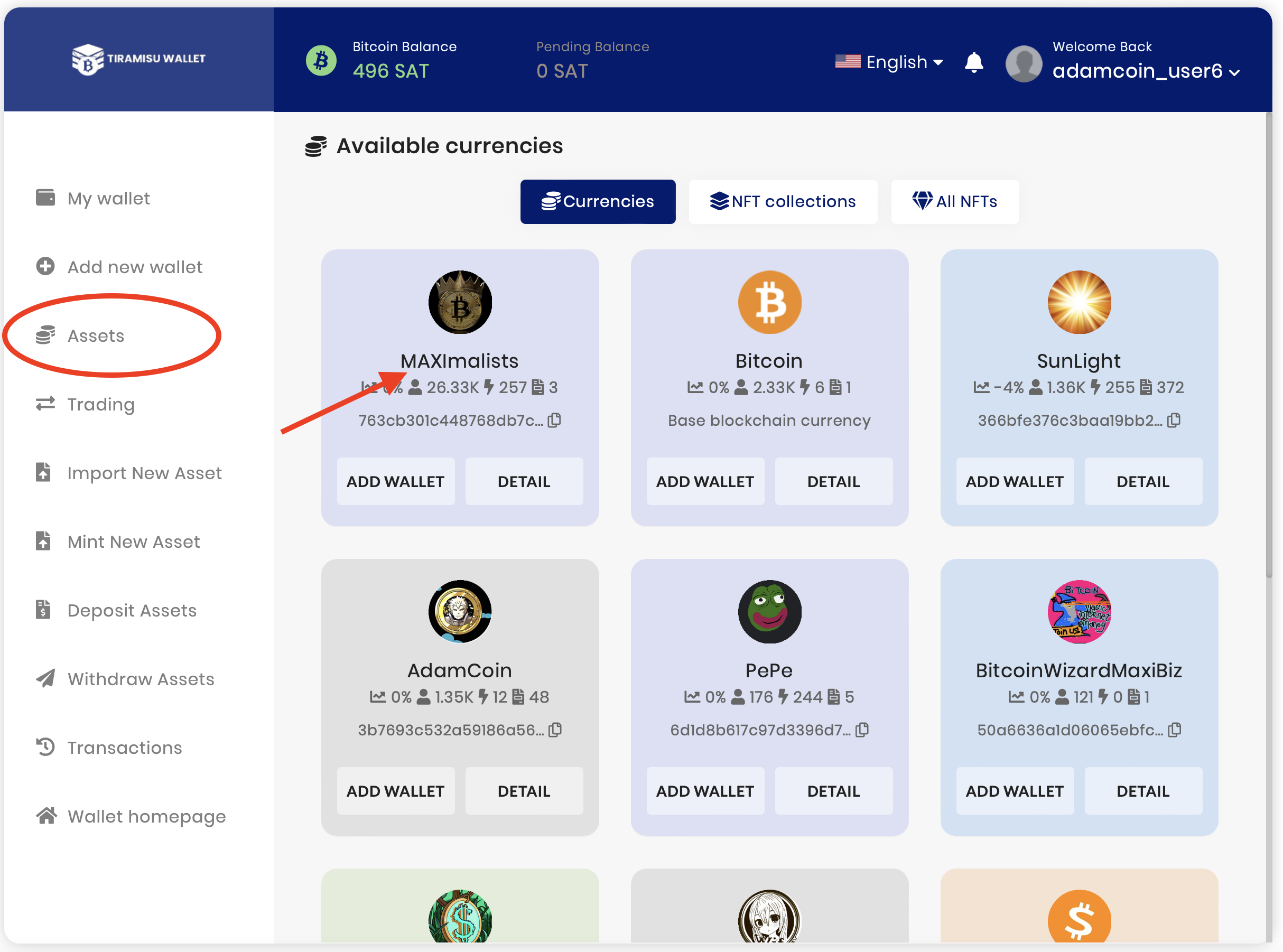 Clicking on the [Assets](https://mainnet.tiramisuwallet.com/walletapp/currencies/) button in the left menu will open a list of currencies available for exchange. Price of each currency is represented as number of SATs / Satoshis per unit of currency.